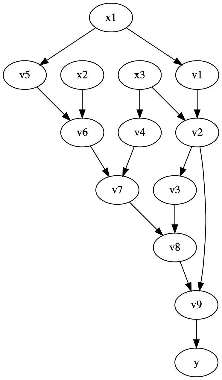 $$\begin{align*} \overline{v_9} &= \frac{\partial f}{\partial v_9} = 1, \\ \overline{v_8} &= \frac{\partial f}{\partial v_9} = \frac{\partial f}{\partial v_9} \cdot \frac{\partial v_9}{\partial v_8} = \overline{v_9} \cdot v_2,\\ \overline{v_7} &= \frac{\partial f}{\partial v_7} = \frac{\partial f}{\partial v_8} \cdot \frac{\partial v_8}{\partial v_7} = \overline{v_8} \cdot 1,\\ \overline{v_6} &= \frac{\partial f}{\partial v_6} = \frac{\partial f}{\partial v_7} \cdot \frac{\partial v_7}{\partial v_6} = \overline{v_7} \cdot v_4,\\ \vdots\\ \overline{v_2} &= \frac{\partial f}{\partial v_2} \\ &= \frac{\partial f}{\partial v_9}\frac{\partial v_9}{\partial v_2} + \frac{\partial f}{\partial v_3}\frac{\partial v_3}{\partial v_2} \\ &= \overline{v_9}\cdot v_8 + \overline{v_3} \cdot cos(v_2) \end{align*}$$As mentioned earlier, the equation of $\overline{v_i}$ includes those variables that include in their definition $v_i$. Hence why we use both $\overline{v_9}$ and $\overline{v_3}$ when computing the adjoint $v_2$ . In practice, when implementing this algorithm, we build a dependency graph whose nodes are the intermediary values, the inputs, and the outputs. In this graph, $v_i$ is connected to $v_j$ if $v_j$ includes $v_i$ in its definition. Computing the derivative amounts to traversing this graph forwards to compute the values $v_i$, then traversing it backward to propagate the adjoints. This is precisely the back-propagation algorithm used in training neural networks.